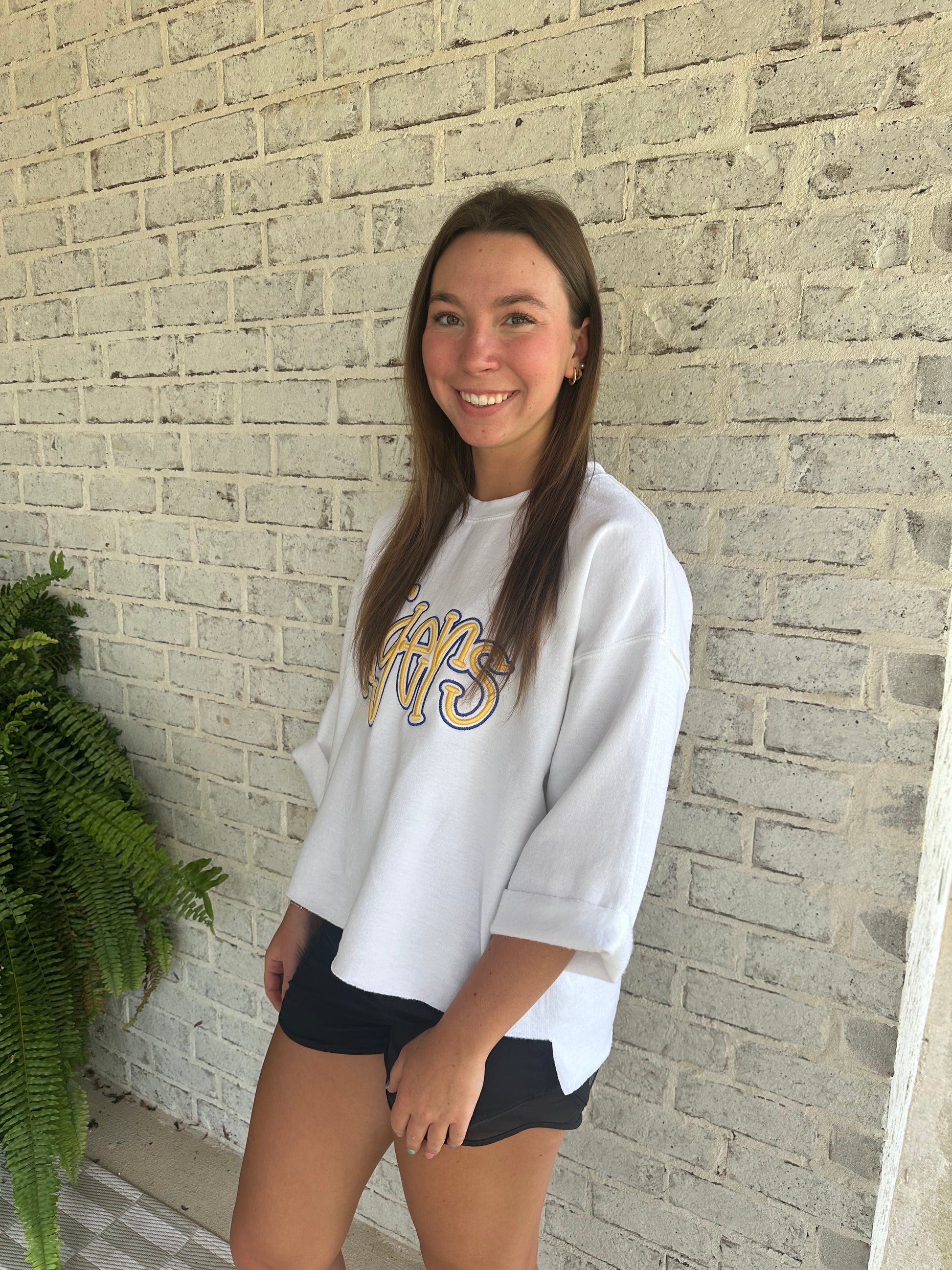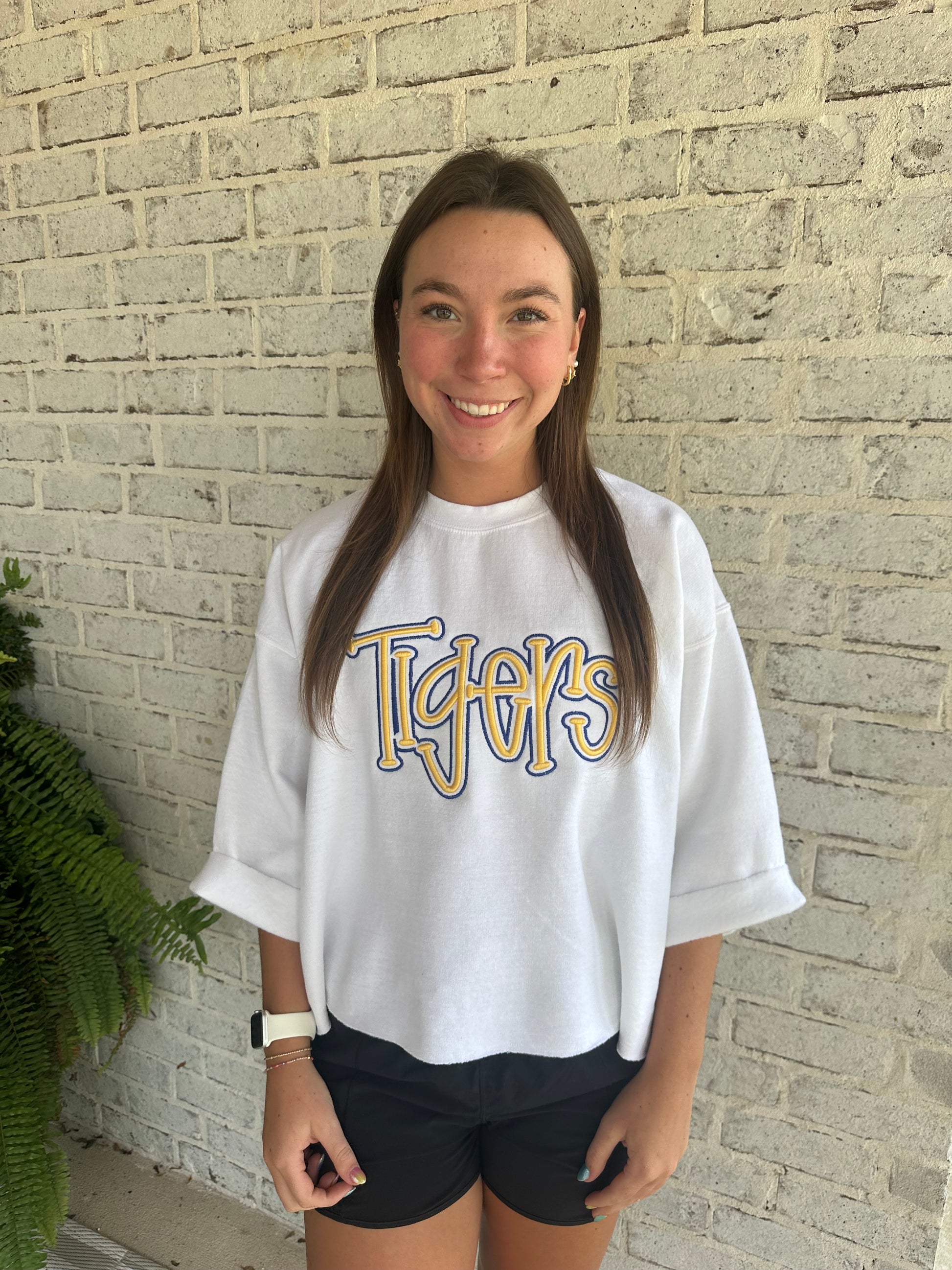 Madison is wearing a size Large in both sweatshirts. The Tigers sweatshirt is cropped 2”. Panthers sweatshirt is cropped 4” (plus bottom band taken off of both)